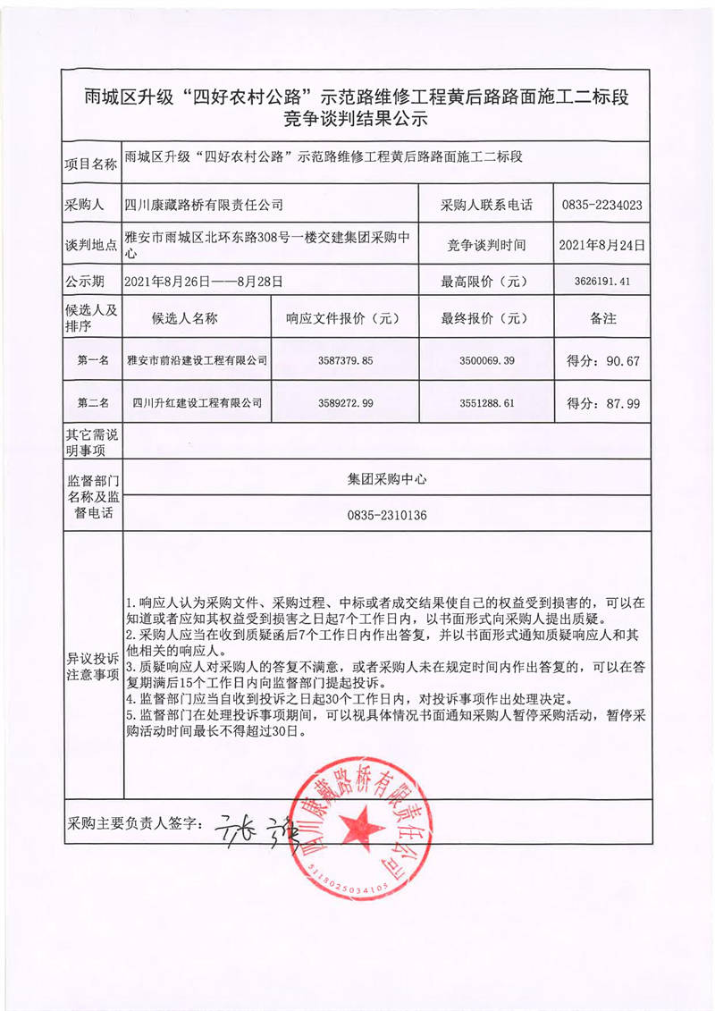 四川康藏路橋有限責(zé)任公司雨城區(qū)升級(jí)“四好農(nóng)材公路”示范路維修工程黃后路路面施工二標(biāo)段競爭談判結(jié)果公示