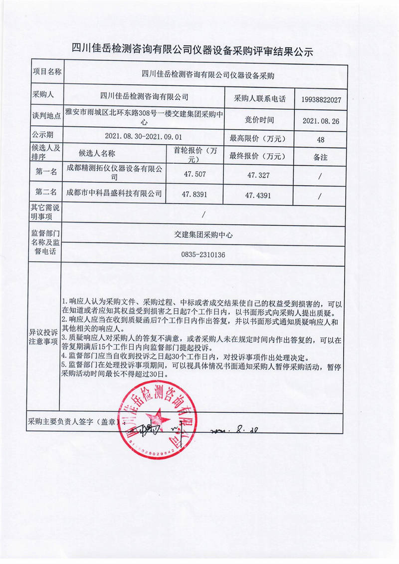 四川佳岳檢測(cè)咨詢有限公司儀器設(shè)備采購評(píng)審結(jié)果公示