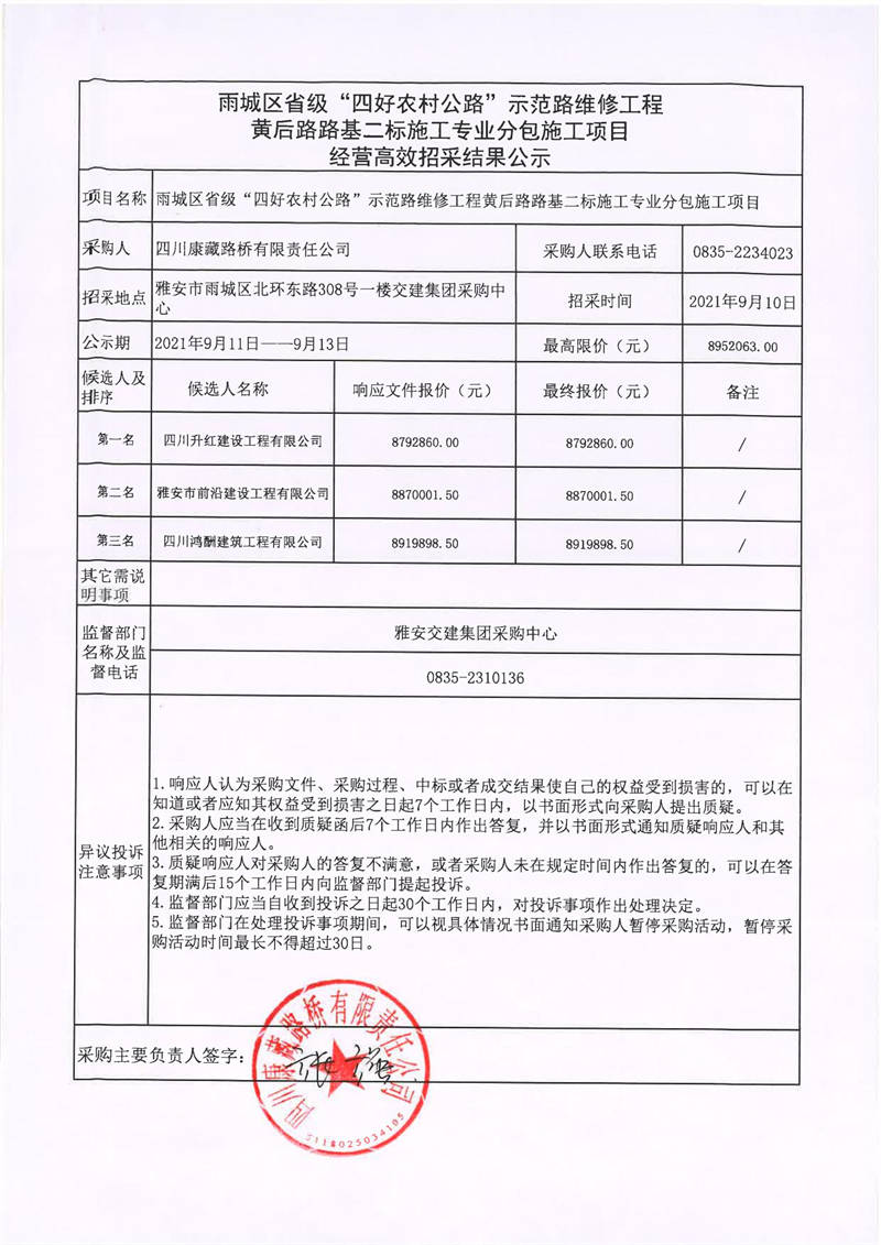 四川康藏路橋有限責任公司雨城區(qū)省級“四好農村公路”示范路維修工程黃后路路基二標施工專業(yè)分包施工項目經營高效招采結果公示