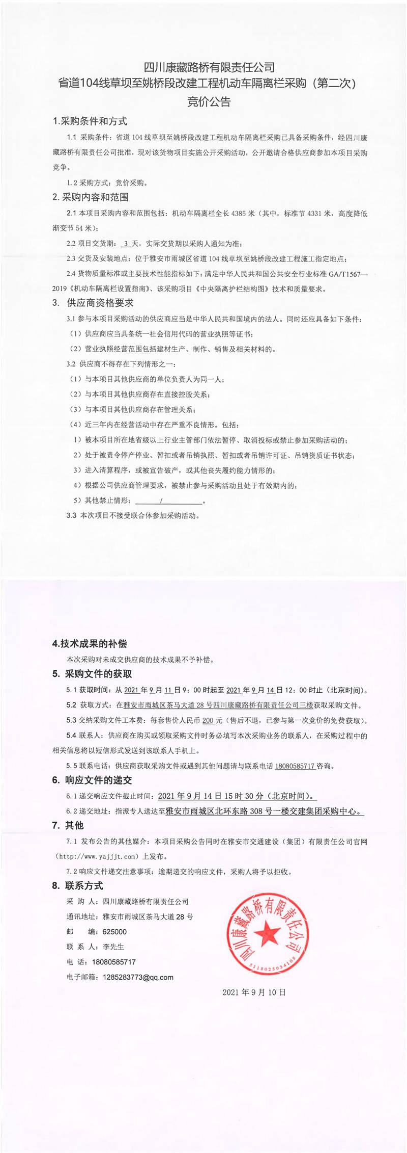 四川康藏路橋有限責(zé)任公司省道104線草壩至姚橋段改建工程機(jī)動車隔離欄采購(第二次)競價(jià)公告