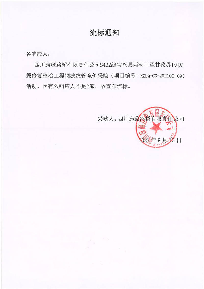 四川康藏路橋有限責(zé)任公司S432線寶興縣兩河口至甘孜界段災(zāi)毀修復(fù)整治工程鋼波紋管競價(jià)采購流標(biāo)通知