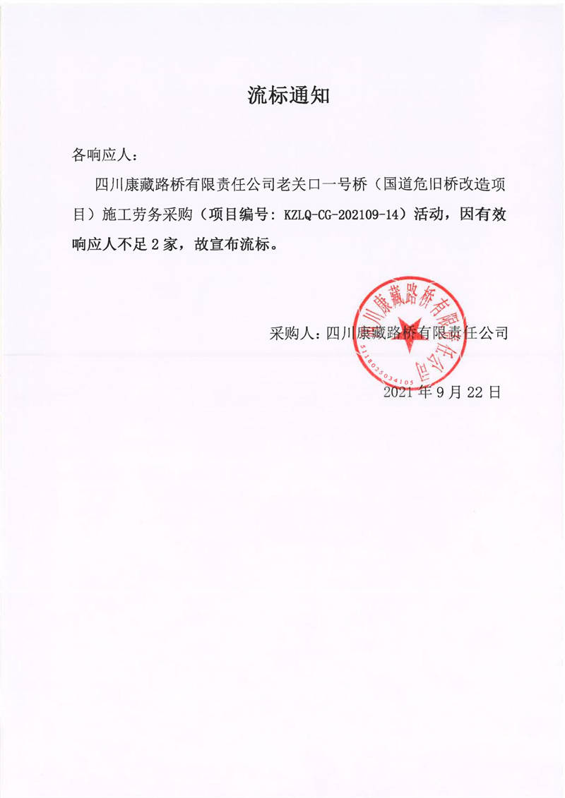 四川康藏路橋有限責任公司老關(guān)口一號橋(國道危舊橋改造項目)施工勞務(wù)采購流標通知