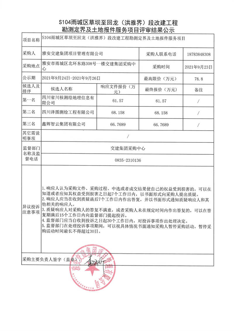雅安交建集團(tuán)項目管理有限公司S104雨城區(qū)草壩至回龍(洪雅界)段改建工程勘測定界及土地報件服務(wù)項目評審結(jié)果公示