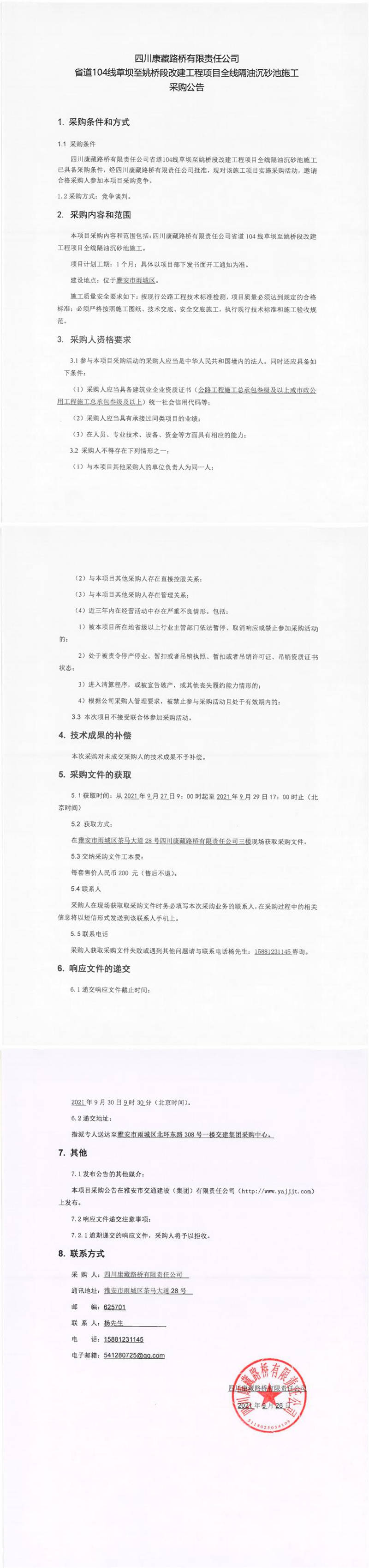 四川康藏路橋有限責任公司省道104線草壩至姚橋段改建工程項目全線隔油沉砂池施工采購公告