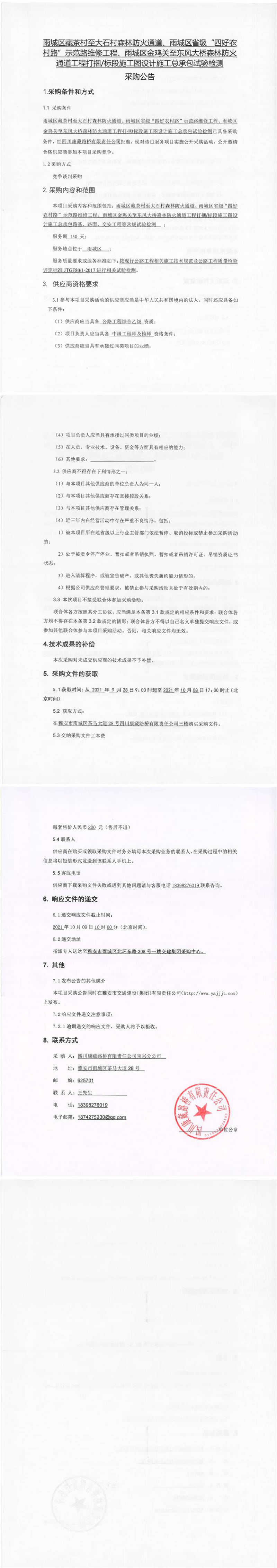 四川康藏路橋有限責(zé)任公司雨城區(qū)藏茶村至大石村森林防火通道、雨城區(qū)省級(jí)“四好農(nóng)村路”示范路維修工程、雨城區(qū)金雞關(guān)至東風(fēng)大橋森林防火通道工程打捆/標(biāo)段施工圖設(shè)計(jì)施工總承包試驗(yàn)檢測(cè)采購公告