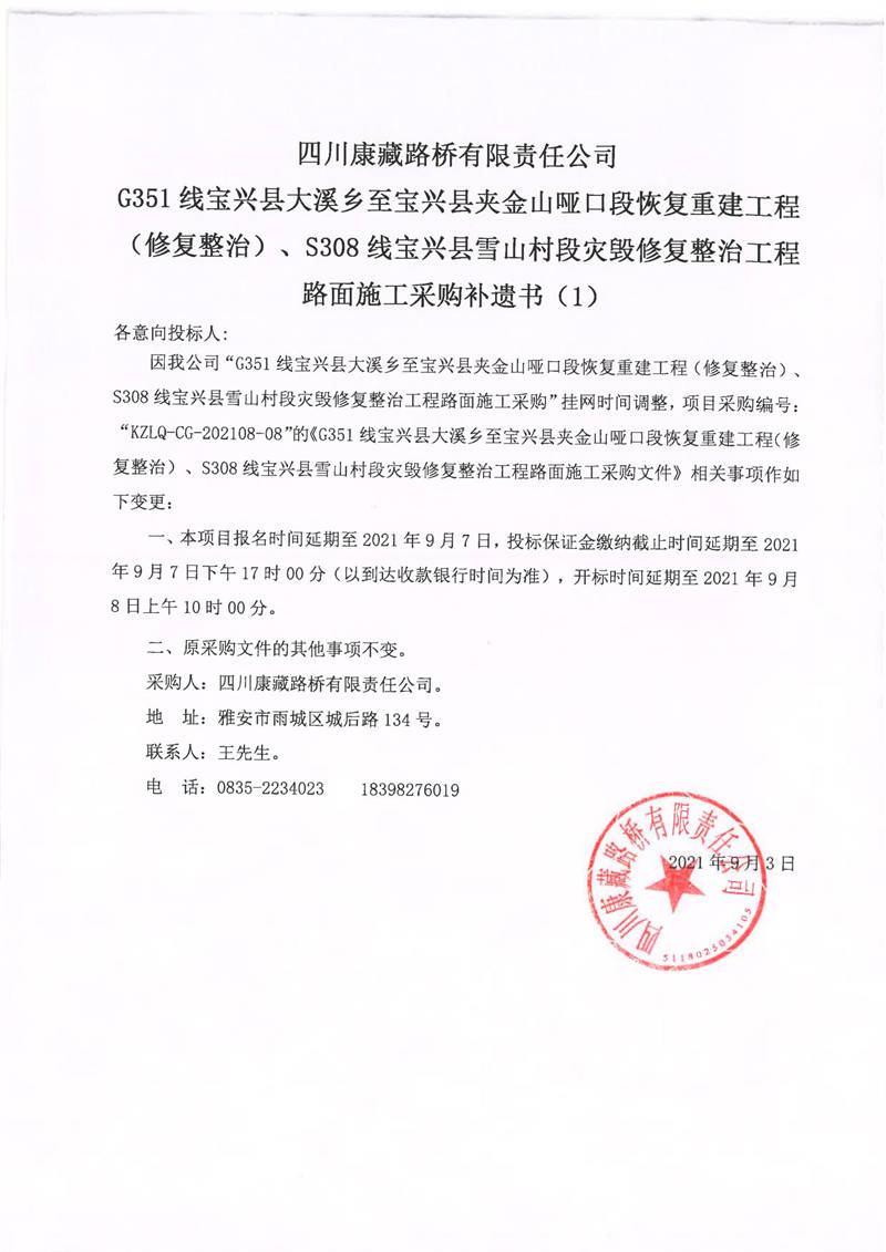 四川康藏路橋有限責(zé)任公司G351線寶興縣大溪鄉(xiāng)至寶興縣夾金山啞口段恢復(fù)重建工程(修復(fù)整治)、S308線寶興縣雪山村段災(zāi)毀修復(fù)整治工程路面施工采購補遺書(1)