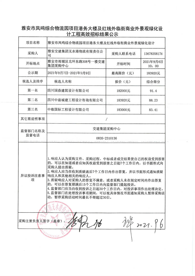 雅安交建集團(tuán)無(wú)水港物流有限責(zé)任公司雅安市鳳鳴綜合物流園項(xiàng)目港務(wù)大樓及紅線(xiàn)外臨街商業(yè)外景觀綠化設(shè)計(jì)工程高效招標(biāo)結(jié)果公示