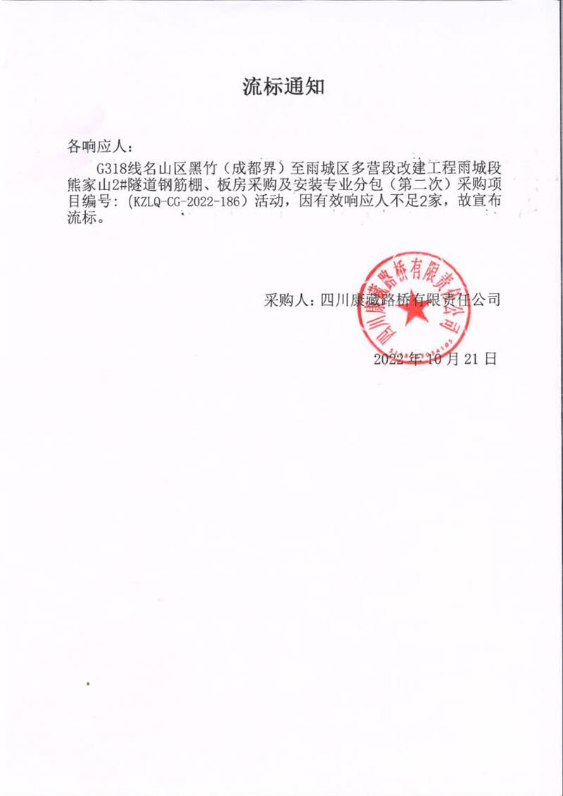 四川康藏路橋有限責任公司G318線名山區(qū)黑竹(成都界)至雨城區(qū)多營段改建工程雨城段熊家山2#隧道鋼筋棚、板房采購及安裝專業(yè)分包采購(第二次)流標通知
