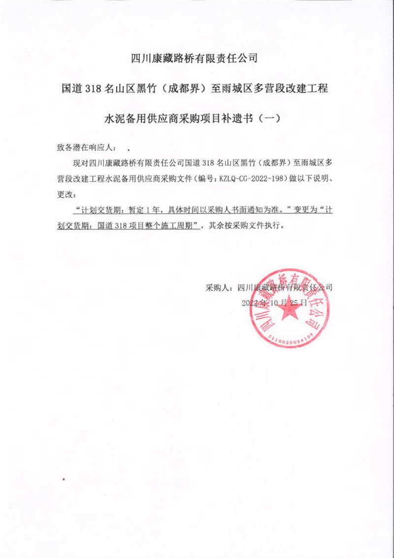 四川康藏路橋有限責任公司國道318名山區(qū)黑竹(成都界)至雨城區(qū)多營段改建工程水泥備用供應商采購項目補遺書(一)