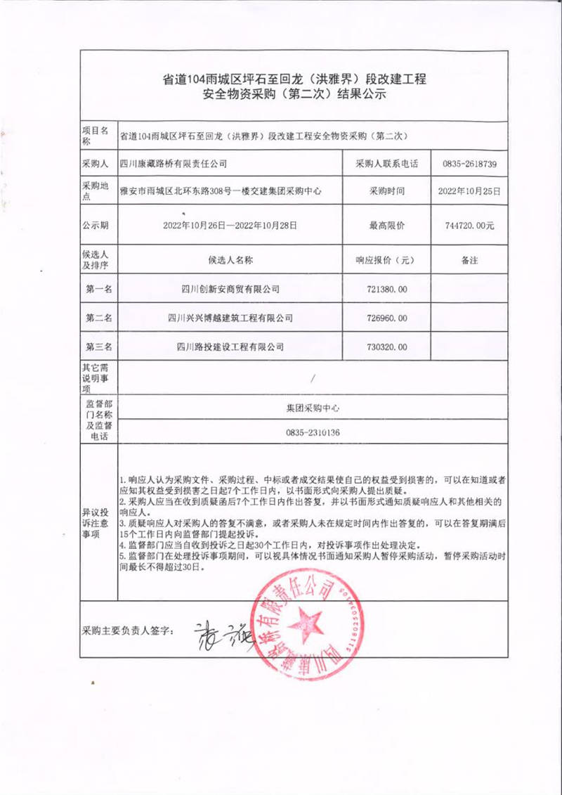 四川康藏路橋有限責任公司省道104雨城區(qū)坪石至回龍(洪雅界)段改建工程安全物資采購(第二次)結果公示