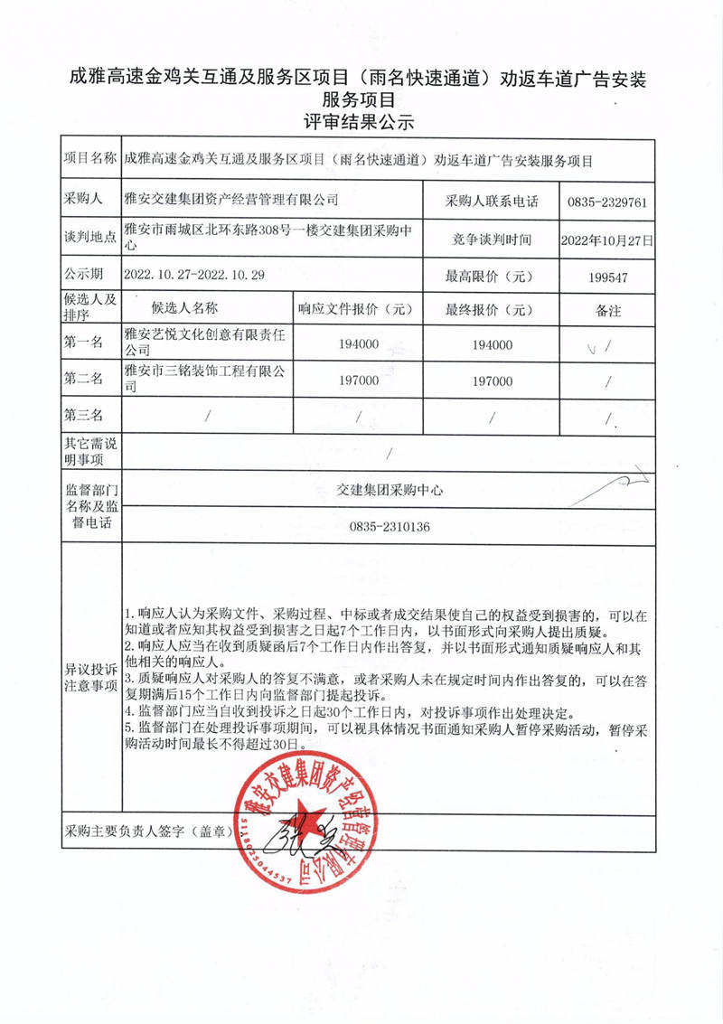 雅安交建集團(tuán)資產(chǎn)經(jīng)營管理有限公司成雅高速金雞關(guān)互通及服務(wù)區(qū)項(xiàng)目(雨名快速通道)勸返車道廣告安裝服務(wù)項(xiàng)目評審結(jié)果公示
