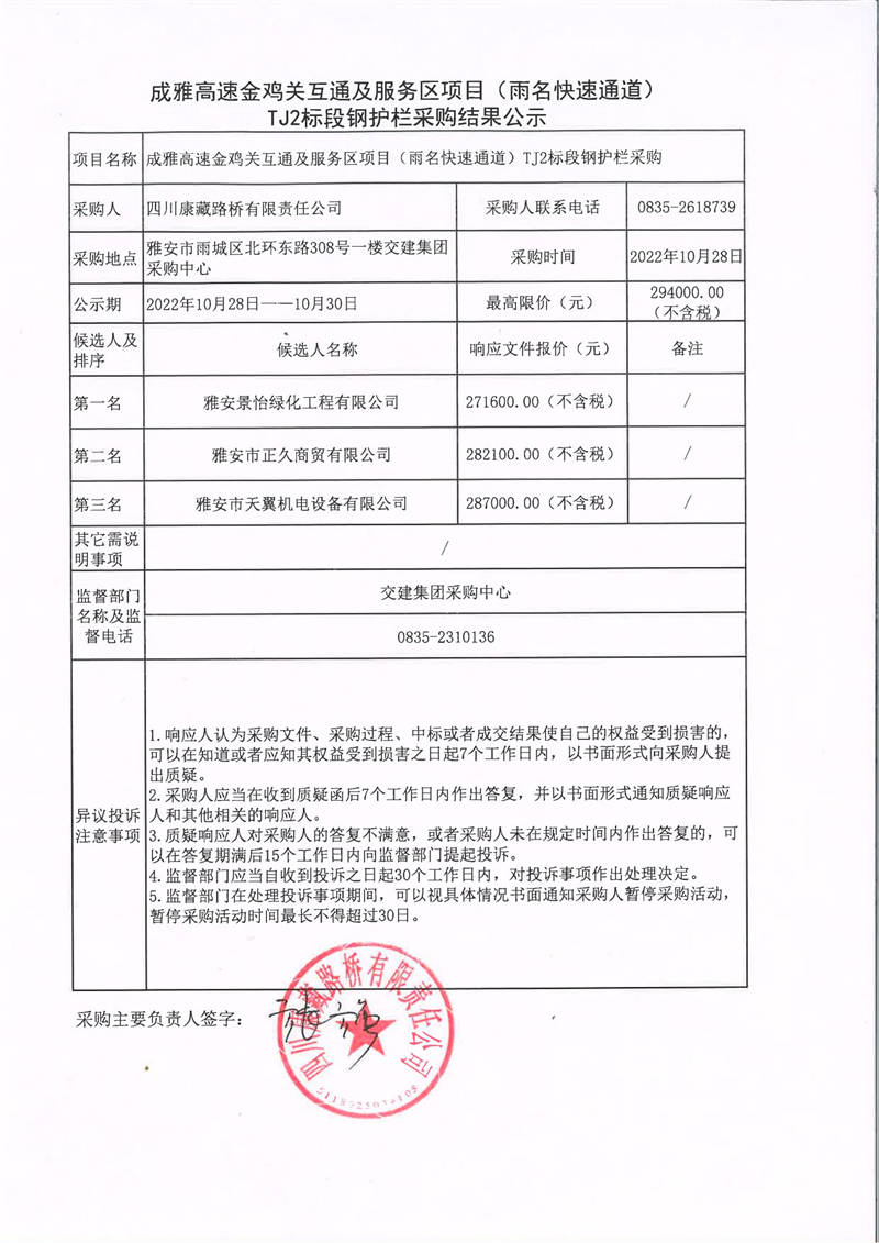 四川康藏路橋有限責任公司成都高速金雞關互通及服務區(qū)項目(雨名快速通道)TJ2標段鋼護欄采購結(jié)果公示