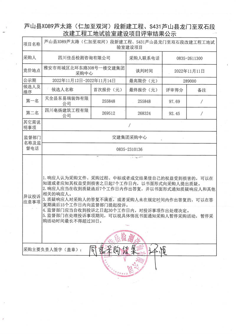 四川佳岳檢測咨詢有限公司蘆山縣X089蘆太路(仁加至雙河)段新建工程、S431蘆山縣龍門至雙石段改建工程工地試驗(yàn)室建設(shè)項(xiàng)目評審結(jié)果公示
