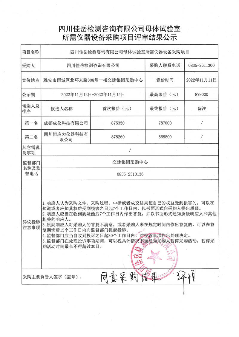 四川佳岳檢測(cè)咨詢(xún)有限公司母體試驗(yàn)室所需儀器設(shè)備采購(gòu)項(xiàng)目評(píng)審結(jié)果公示
