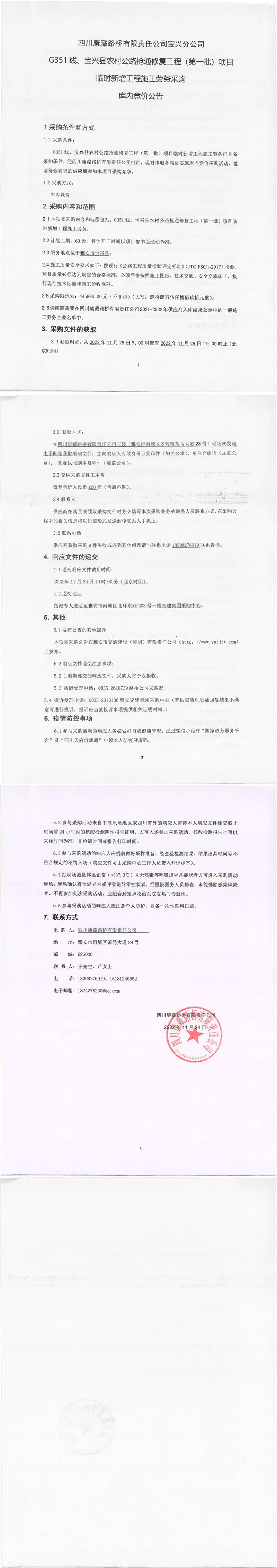 四川康藏路橋有限責(zé)任公司G351線、寶興縣農(nóng)村公路搶通修復(fù)工程(第一批)項目臨時新增工程施工勞務(wù)采購庫內(nèi)競價公告