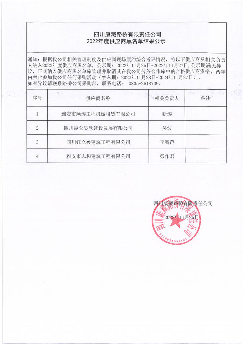 四川康藏路橋有限責任公司2022年度供應商黑名單結(jié)果公示