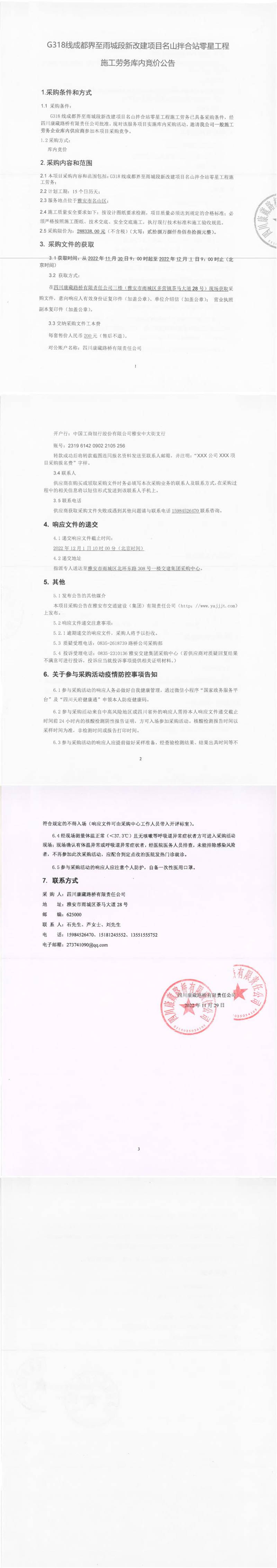 四川康藏路橋有限責(zé)任公司G318線成都界至雨城段新改建項(xiàng)目名山拌合站零星工程施工勞務(wù)庫(kù)內(nèi)競(jìng)價(jià)公告