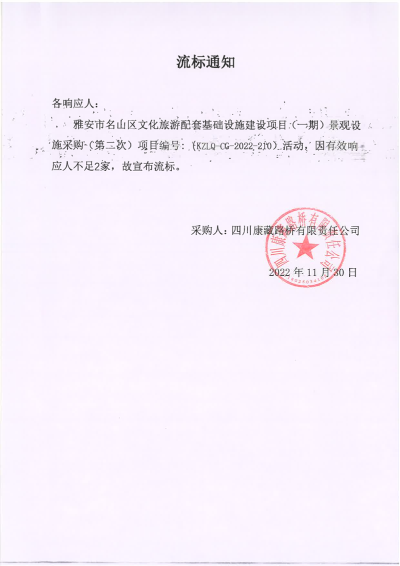四川康藏路橋有限責(zé)任公司雅安市名山區(qū)文化旅游配套基礎(chǔ)設(shè)施建設(shè)項(xiàng)目(一期)景觀設(shè)施采購(gòu)(第二次)流標(biāo)通知