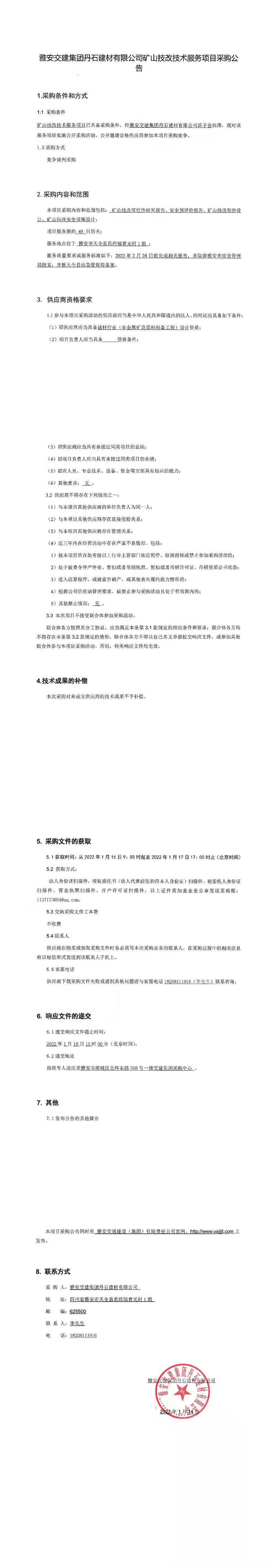 雅安交建集團(tuán)丹石建材有限公司礦山技改技術(shù)服務(wù)項目采購公告