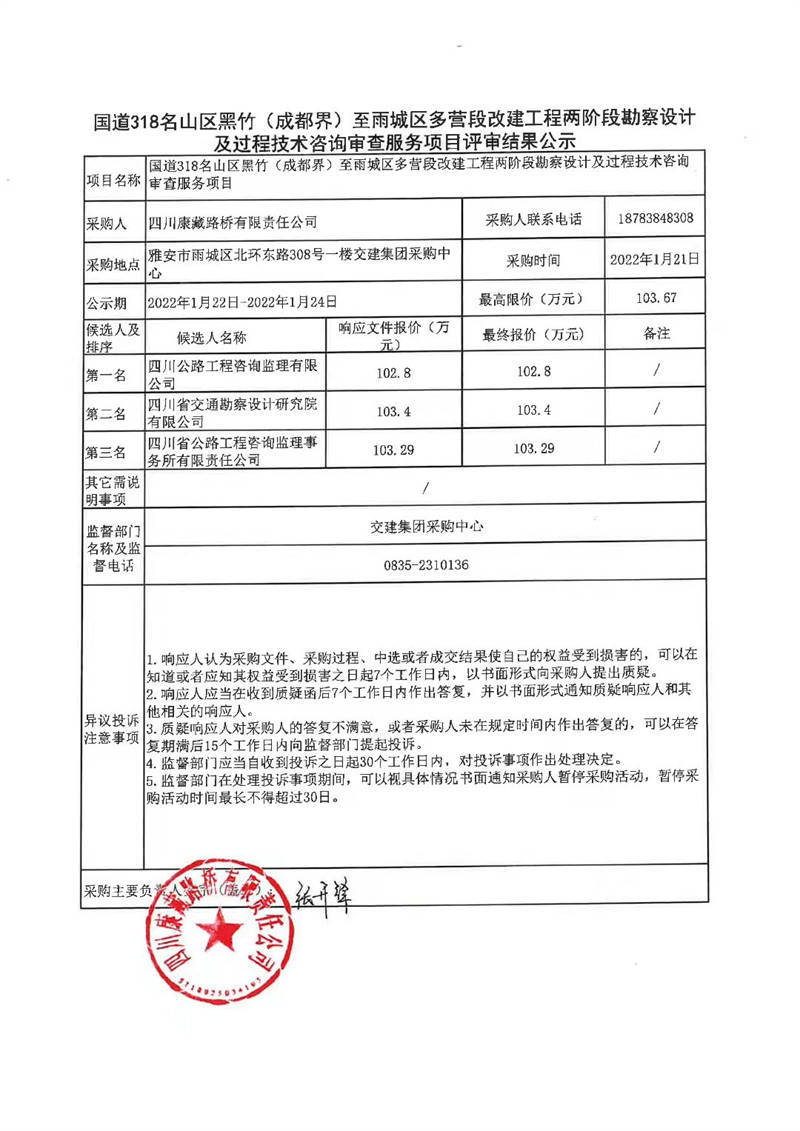 四川康藏路橋有限責(zé)任公司國道318名山區(qū)黑竹(成都界)至雨城區(qū)多營段改建工程兩階段勘察設(shè)計(jì)及過程技術(shù)咨詢審查服務(wù)項(xiàng)目評審結(jié)果公示