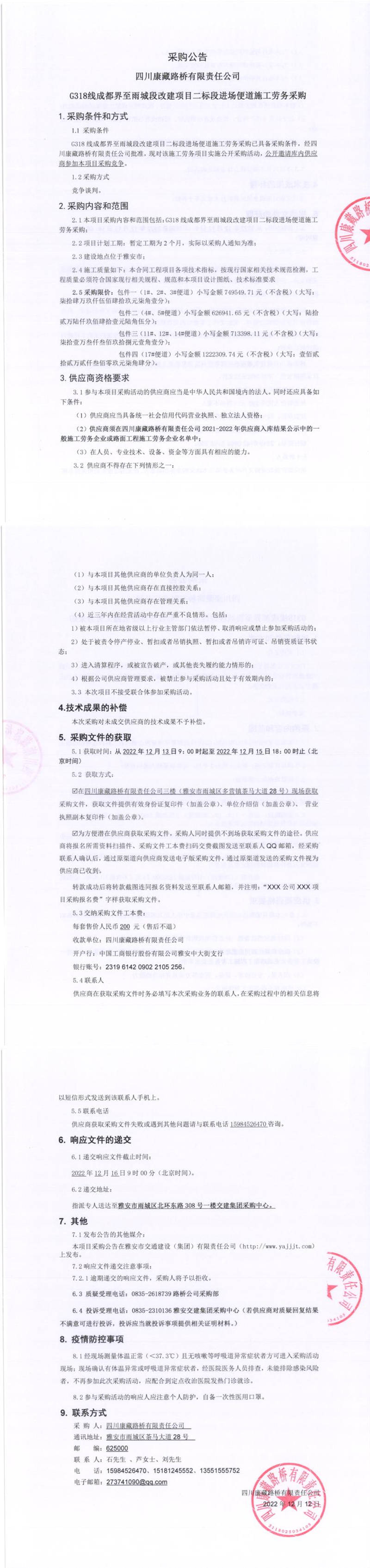 四川康藏路橋有限責任公司G318線成都界至雨城段新改建項目二標段進場便道施工勞務采購公告