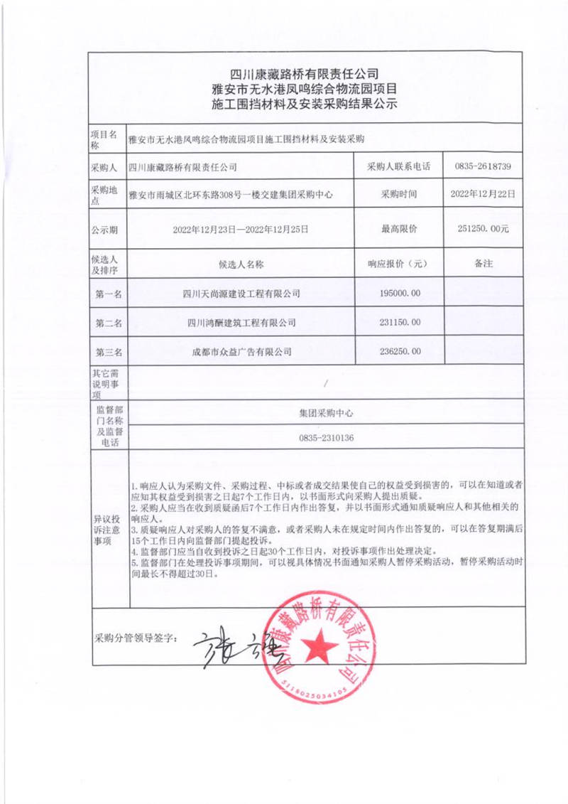 四川康藏路橋有限責(zé)任公司雅安市無水港鳳鳴綜合物流園項(xiàng)目施工圍擋材料及安裝采購(gòu)結(jié)果公示