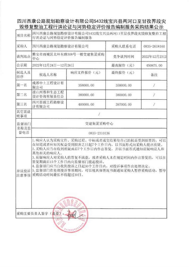 四川西康公路規(guī)劃勘察設(shè)計有限公司S432線寶興縣兩河口至甘孜界段災(zāi)毀修復(fù)整治工程行洪論證與河勢穩(wěn)定評價報告編制服務(wù)采購結(jié)果公示