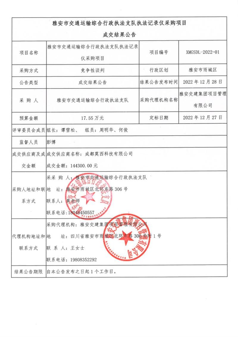 雅安交建集團(tuán)項(xiàng)目管理有限公司雅安市交通運(yùn)輸綜合行政執(zhí)法支隊(duì)執(zhí)法記錄儀采購項(xiàng)目成交結(jié)果公告