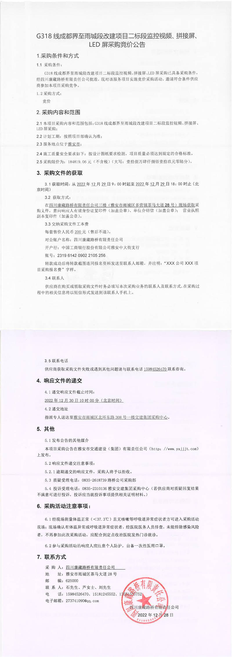 四川康藏路橋有限責(zé)任公司G318線成都界至雨城段改建項目二標(biāo)段監(jiān)控視頻、拼接屏、LED屏采購競價公告