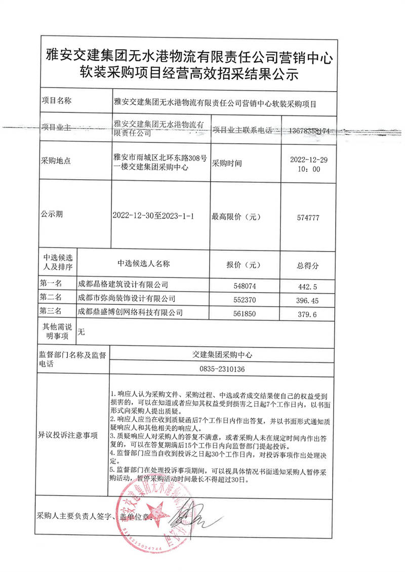 雅安交建集團無水港物流有限責(zé)任公司營銷中心軟裝采購項目經(jīng)營高效招采結(jié)果公示