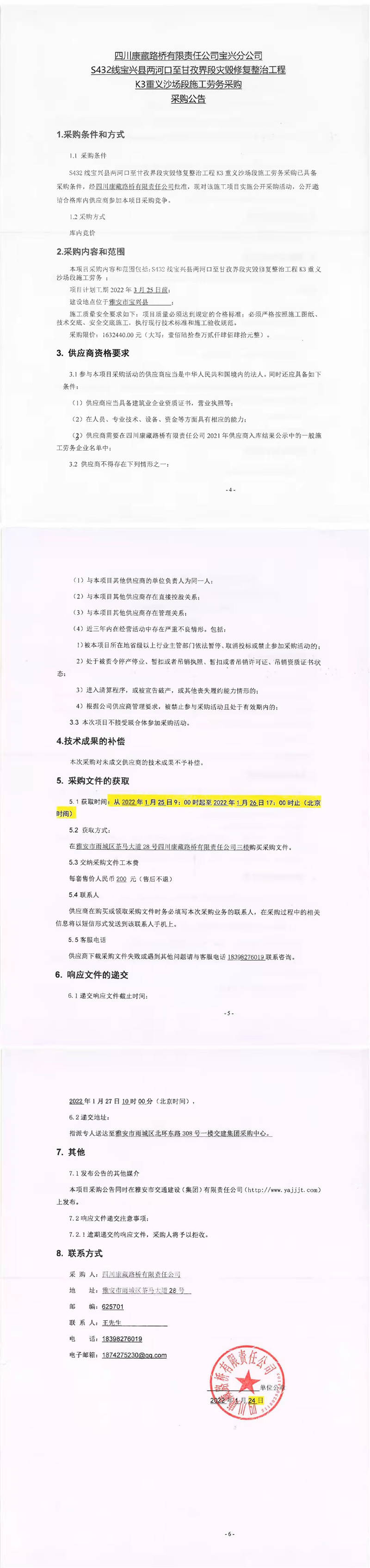四川康藏路橋有限責(zé)任公司寶興分公司S432線寶興縣兩河口至甘孜界段災(zāi)毀修復(fù)整治工程K3重義沙場(chǎng)段施工勞務(wù)采購采購公告