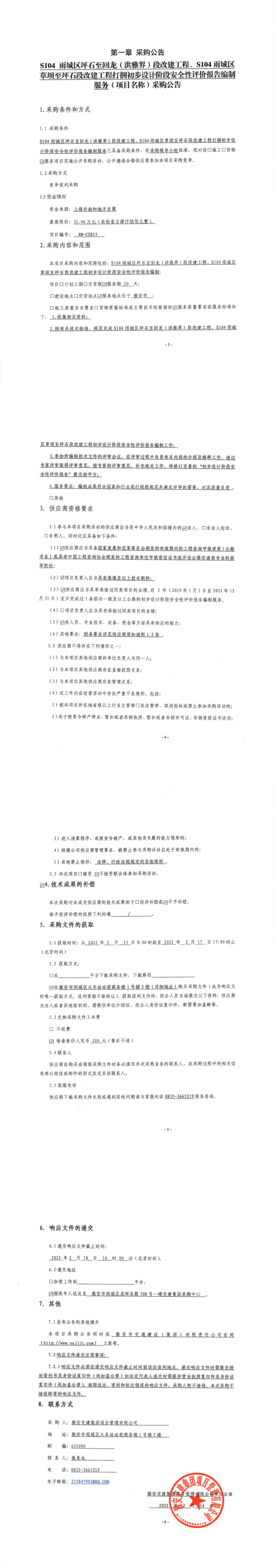 雅安交建集團(tuán)項(xiàng)目管理有限公司S104雨城區(qū)坪石至回龍(洪雅界)段改建工程、S104雨城區(qū)草壩至坪石段改建工程打捆初步設(shè)計(jì)階段安全性評(píng)價(jià)報(bào)告編制服務(wù)采購公告