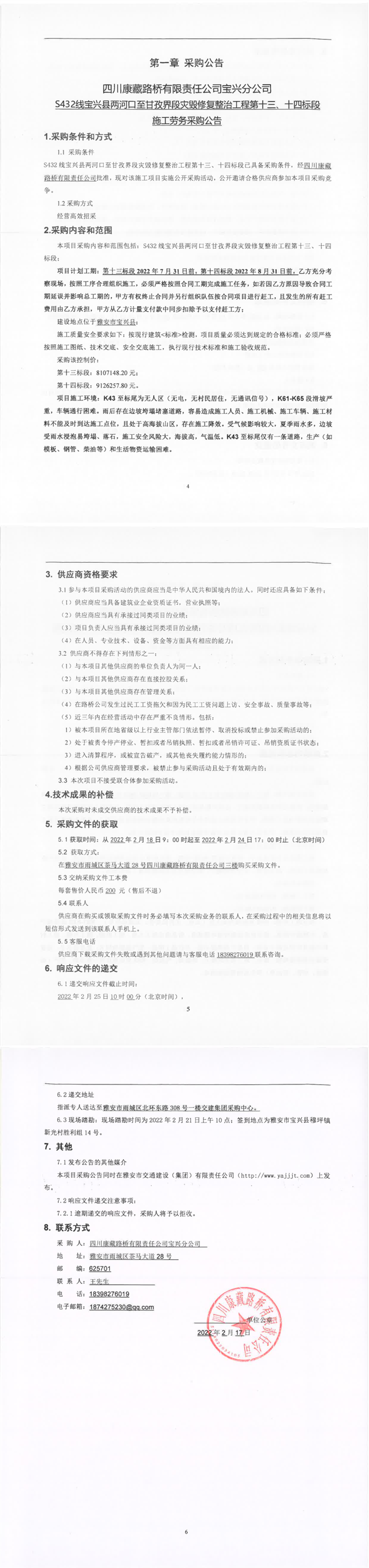 四川康藏路橋有限責任公司S432線寶興縣兩河口至甘孜界段災毀修復整治工程第十三、十四標段施工勞務(wù)采購公告