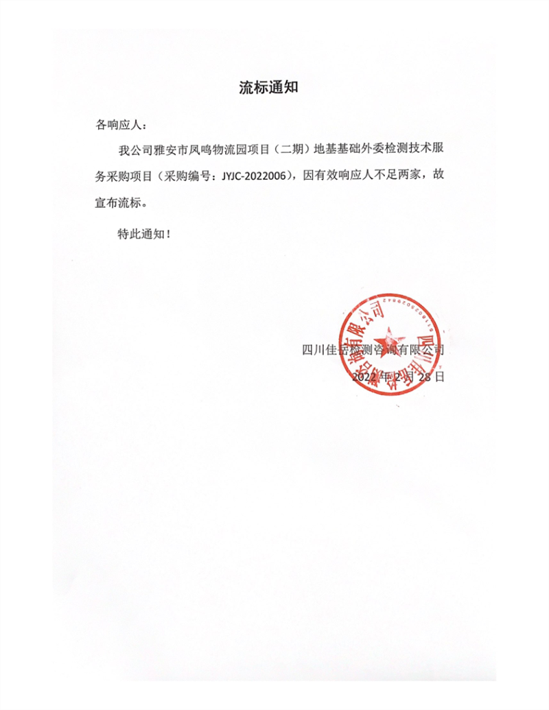四川佳岳檢測咨詢有限公司雅安市鳳鳴物流園項(xiàng)目(二期)地基基礎(chǔ)外委檢測技術(shù)服務(wù)采購項(xiàng)目流標(biāo)通知