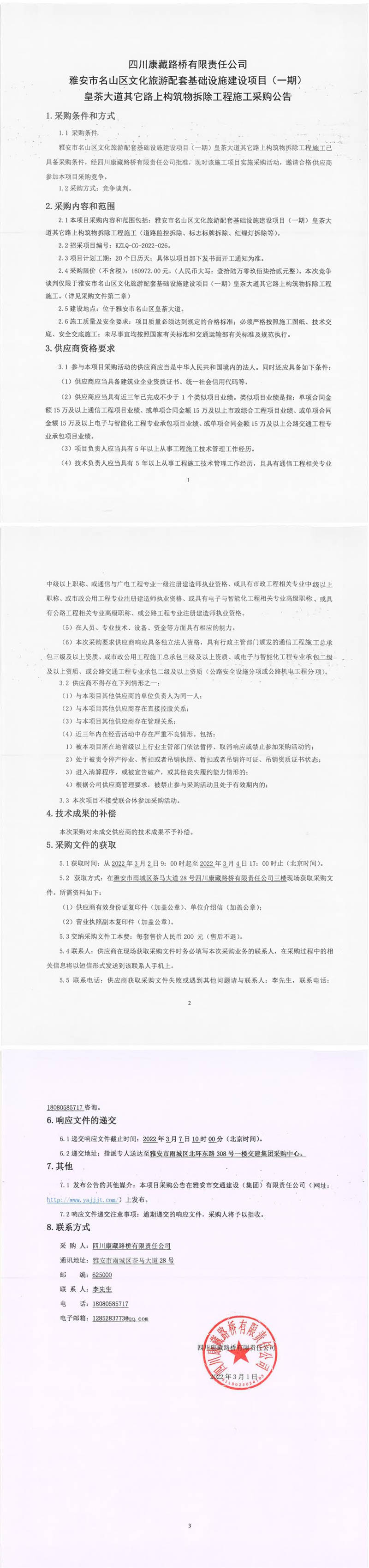 四川康藏路橋有限責(zé)任公司雅安市名山區(qū)文化旅游配套基礎(chǔ)設(shè)施建設(shè)項目(一期)皇茶大道其它路上構(gòu)筑物拆除工程施工采購公告