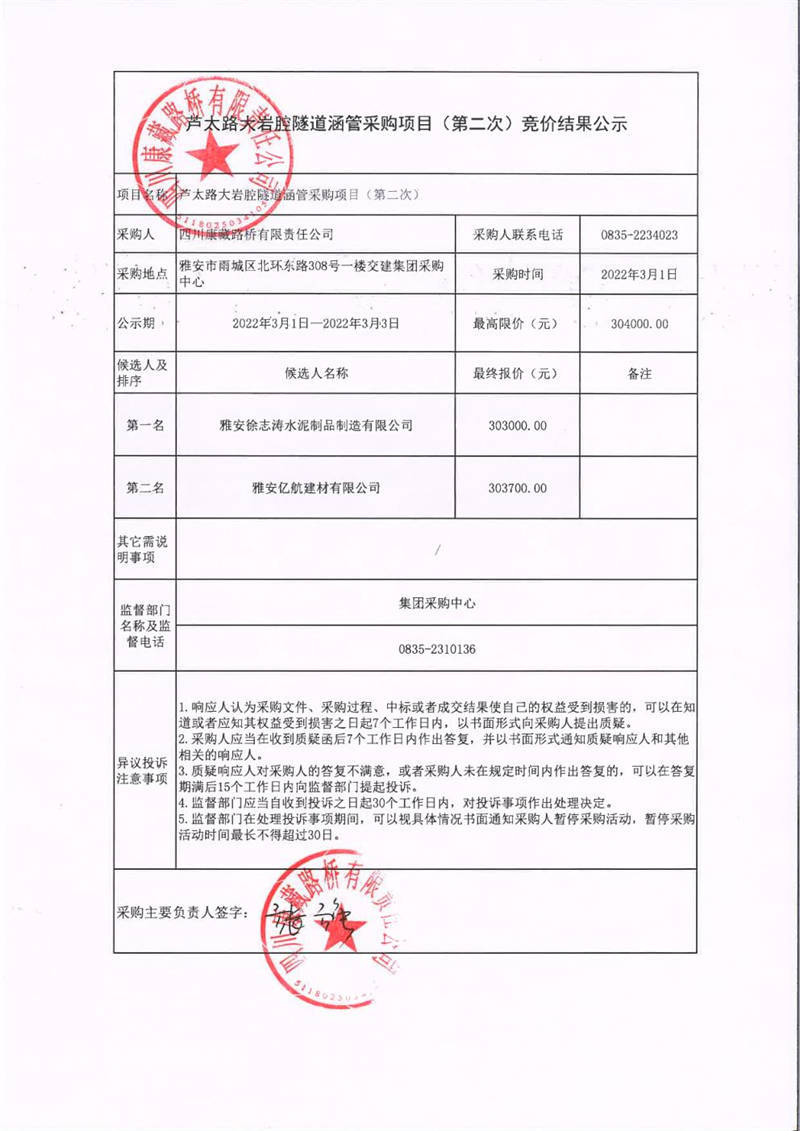 四川康藏路橋有限責(zé)任公司蘆太路大巖腔隧道涵管采購(gòu)項(xiàng)目(第二次)競(jìng)價(jià)結(jié)果公示