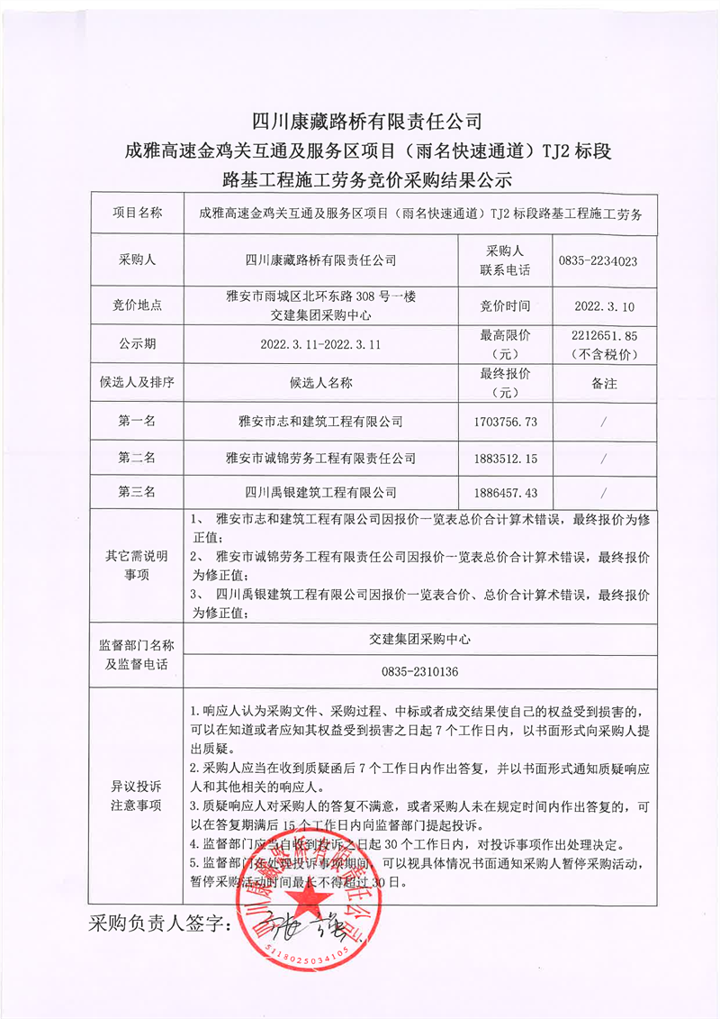 四川康藏路橋有限責任公司成雅高速金雞關互通及服務區(qū)項目(雨名快速通道)TJ2標段路基工程施工勞務競價采購結果公示
