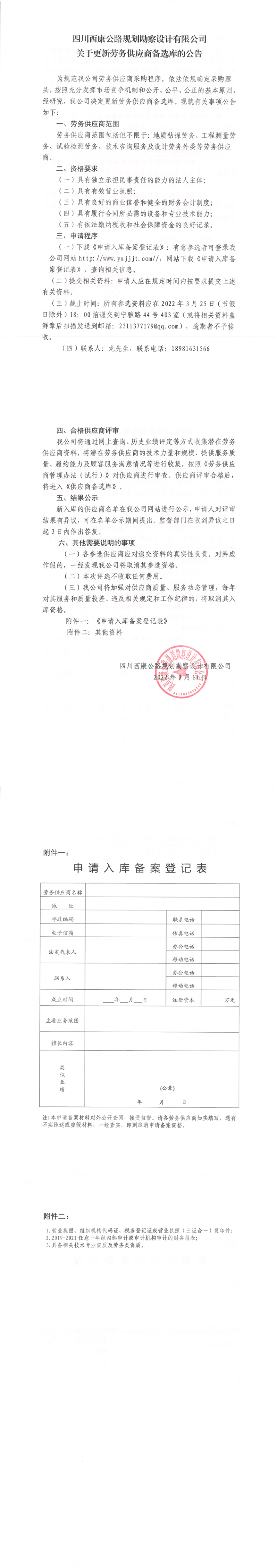 四川西康公路規(guī)劃勘察設(shè)計(jì)有限公司關(guān)于更新勞務(wù)供應(yīng)商備選庫(kù)的公告