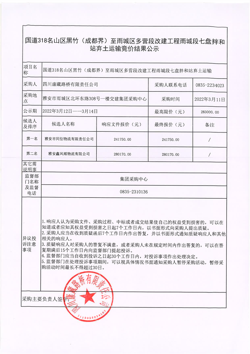 四川康藏路橋有限責(zé)任公司國道318名山區(qū)黑竹(成都界)至雨城區(qū)多營段改建工程雨城段七盤拌和站棄土運(yùn)輸競價結(jié)果公示
