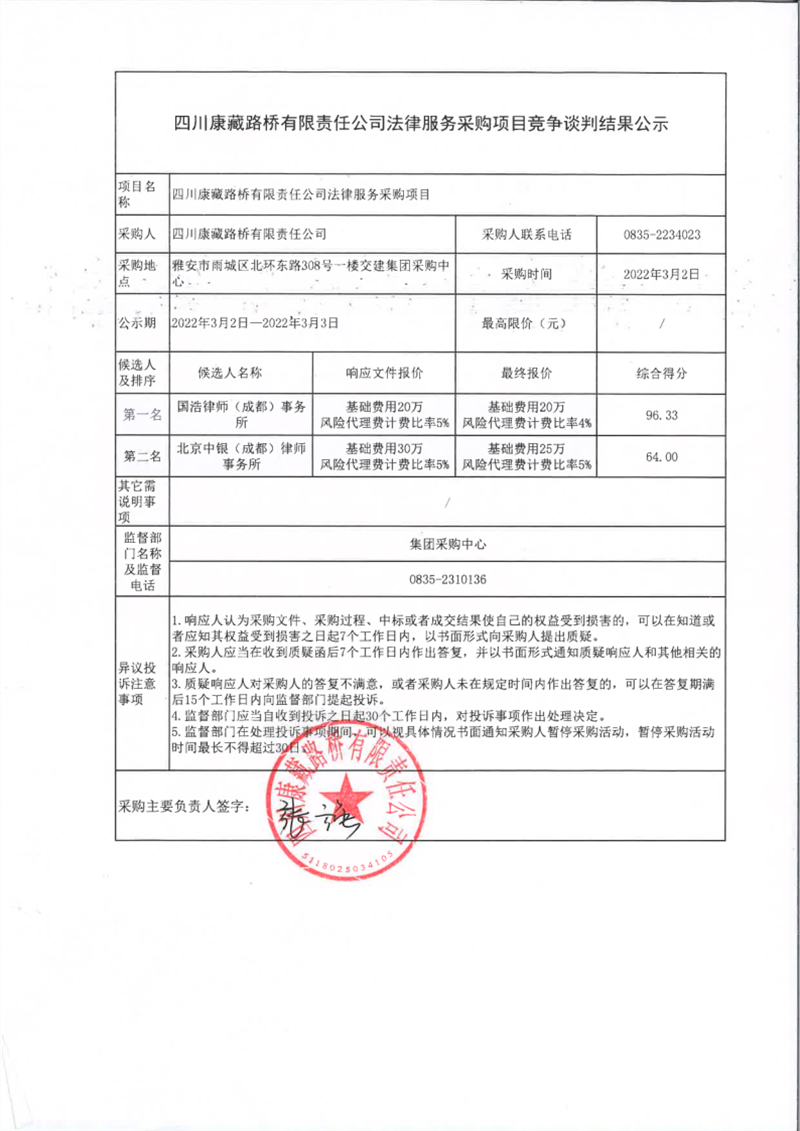 四川康藏路橋有限責任公司法律服務采購項目競爭談判結(jié)果公示
