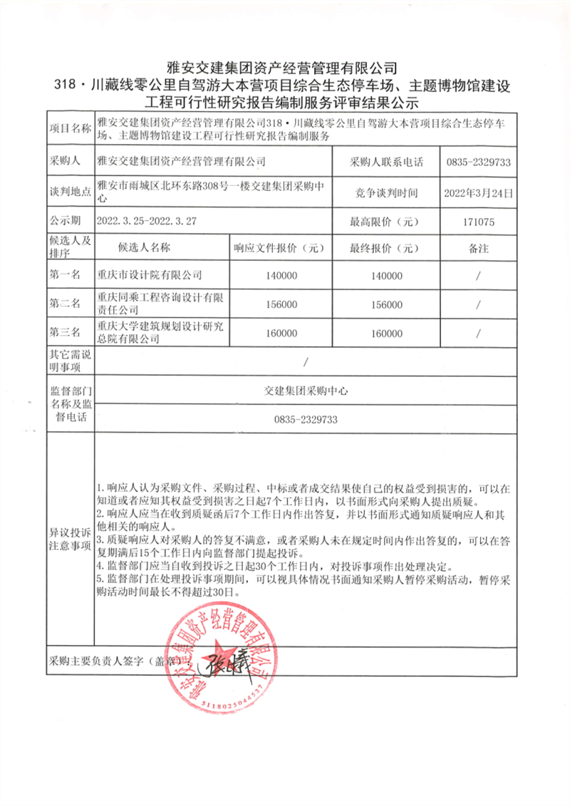 雅安交建集團(tuán)資產(chǎn)經(jīng)營管理有限公司318.川藏線零公里自駕游大本營項(xiàng)目綜合生態(tài)停車場、主題博物館建設(shè)工程可行性研究報(bào)告編制服務(wù)評(píng)審結(jié)果公示