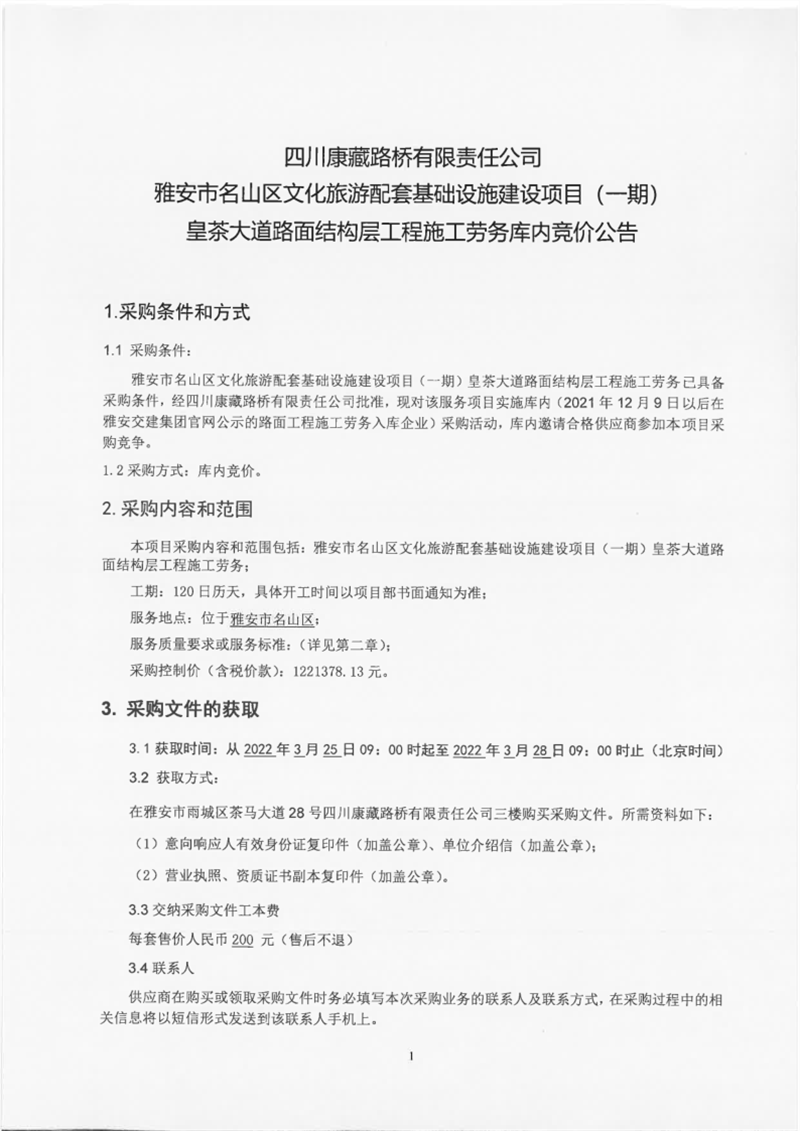 四川康藏路橋有限責任公司雅安市名山區(qū)文化旅游配套基礎(chǔ)設(shè)施建設(shè)項目(一期)皇茶大道路面結(jié)構(gòu)層工程施工勞務庫內(nèi)競價公告