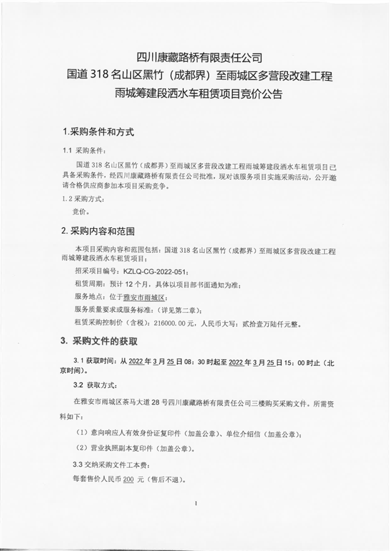 四川康藏路橋有限責(zé)任公司國道318名山區(qū)黑竹(成都界)至雨城區(qū)多營段改建工程雨城籌建段灑水車租賃項(xiàng)目競價公告