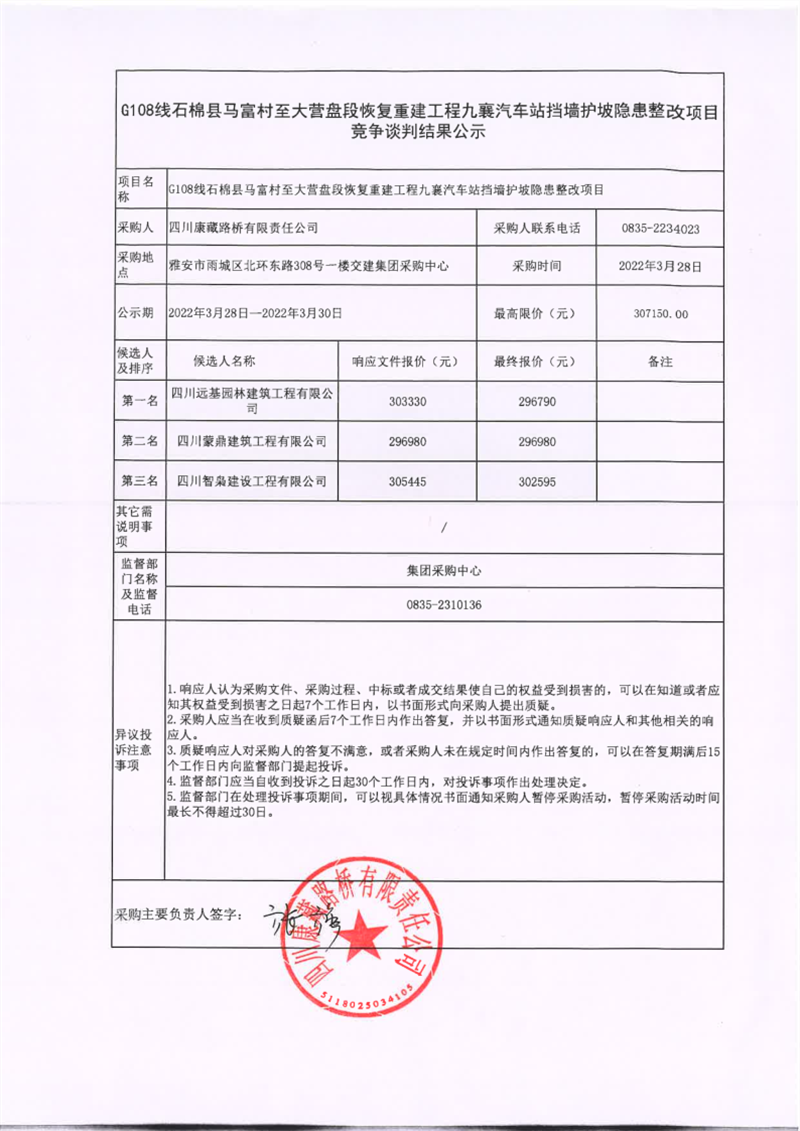 四川康藏路橋有限責(zé)任公司G108線石棉縣馬福村至大營盤段恢復(fù)重建九襄汽車站擋墻護(hù)坡隱患整改項(xiàng)目競爭談判結(jié)果公示