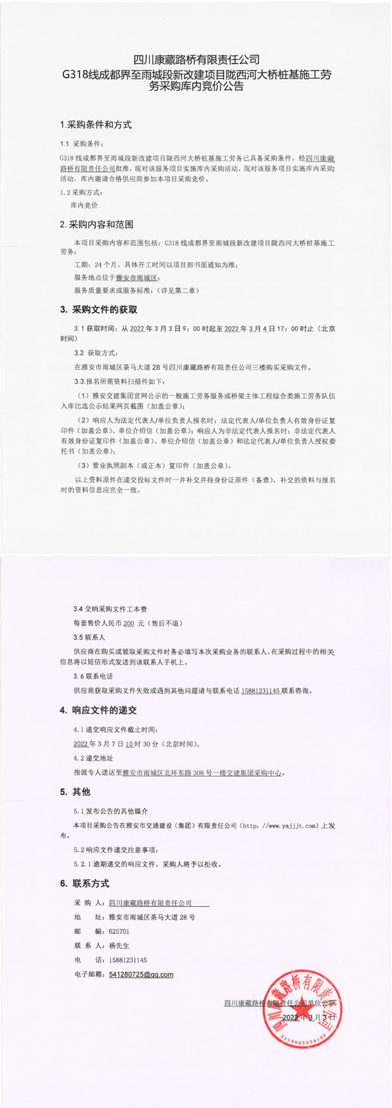 四川康藏路橋有限責(zé)任公司G318線成都界至雨城段新改建項目隴西河大橋樁基施工勞務(wù)采購庫內(nèi)競價公告