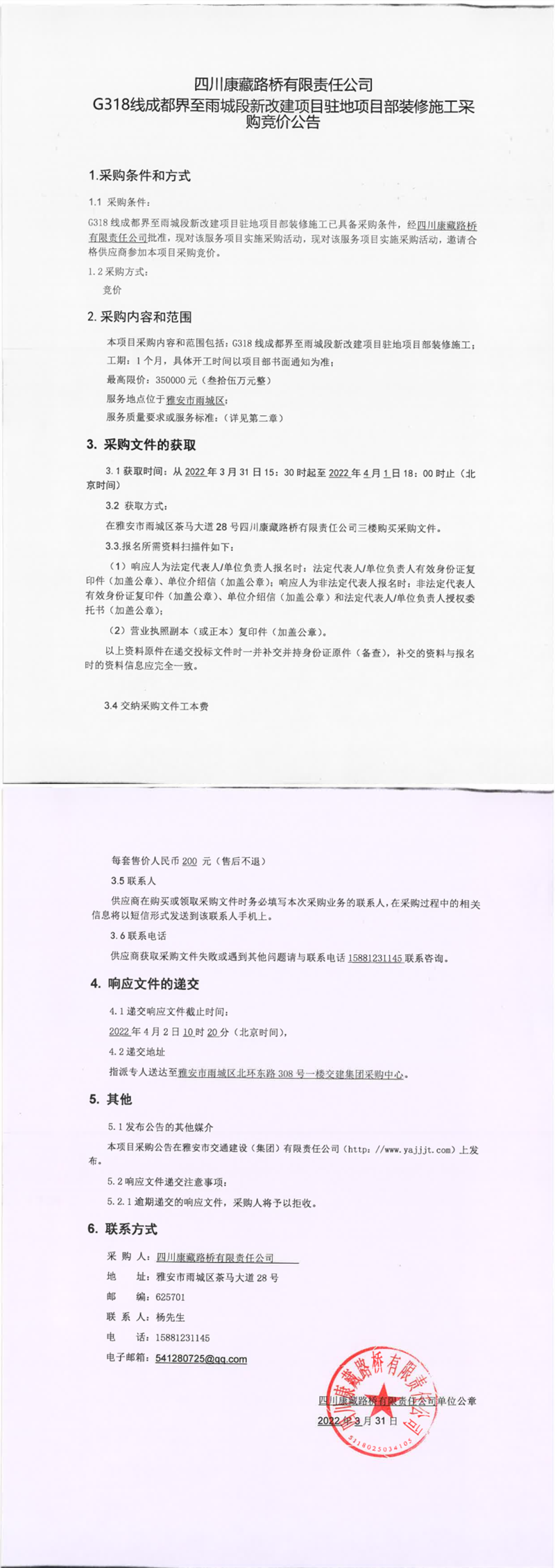 四川康藏路橋有限責(zé)任公司G318線成都界至雨城段新改建項目駐地項目部裝修施工采購競價公告