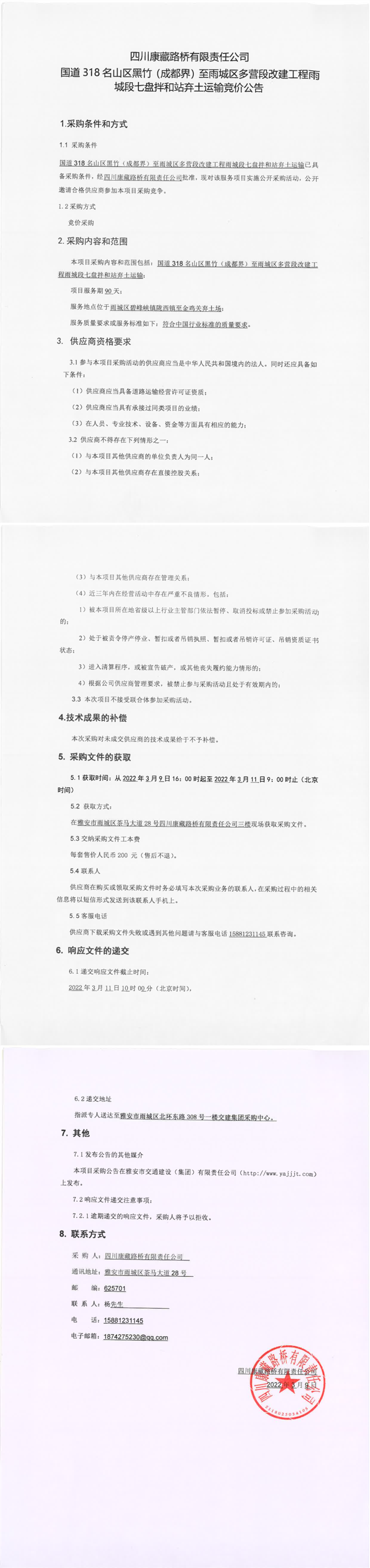 四川康藏路橋有限責任公司國道318名山區(qū)黑竹(成都界)至雨城區(qū)多營段改建工程雨城段七盤拌和站棄土運輸競價公告