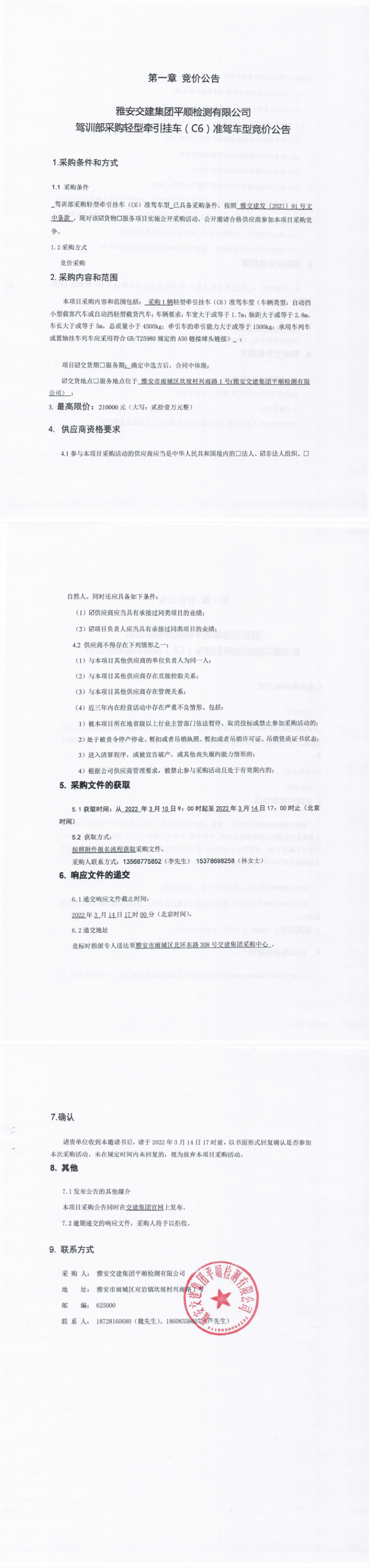 雅安交建集團平順檢測有限公司駕訓部采購輕型牽引掛車(C6)準駕車型競價公告