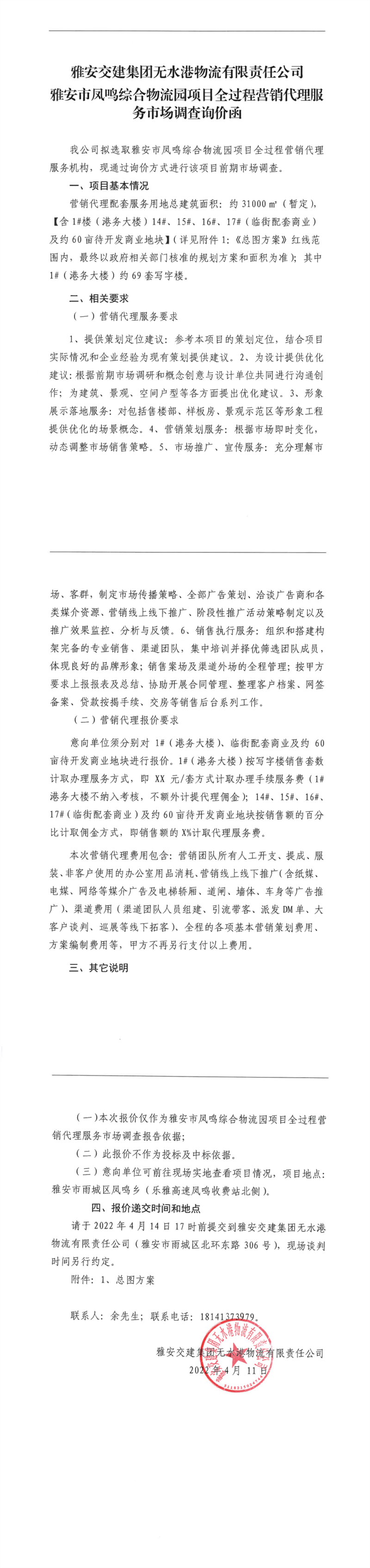 雅安交建集團(tuán)無水港物流有限責(zé)任公司雅安市鳳鳴綜合物流園項目全過程營銷代理服務(wù)市場調(diào)查詢價函