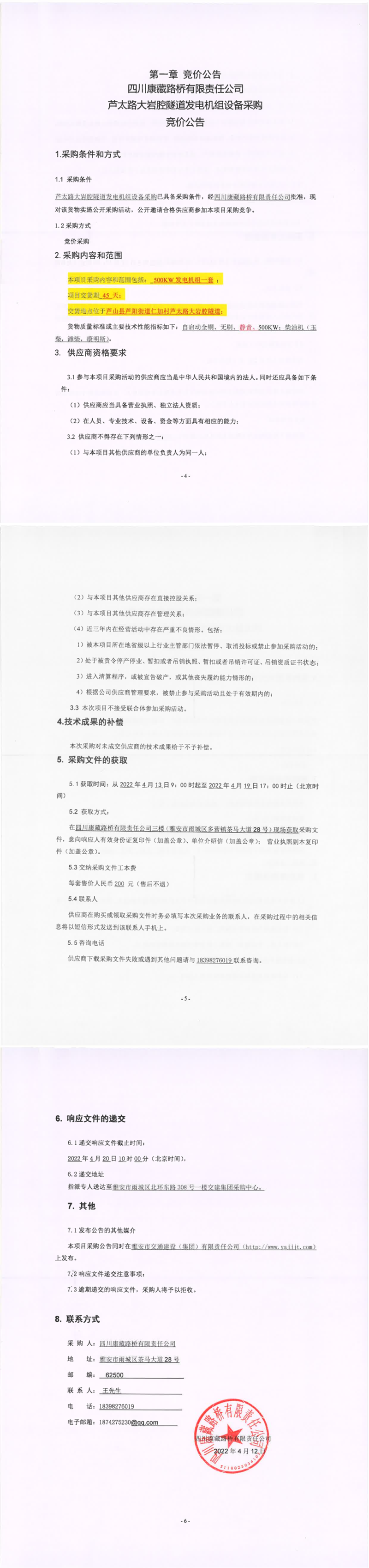 四川康藏路橋有限責(zé)任公司蘆太路大巖腔隧道發(fā)電機(jī)組設(shè)備采購(gòu)競(jìng)價(jià)公告